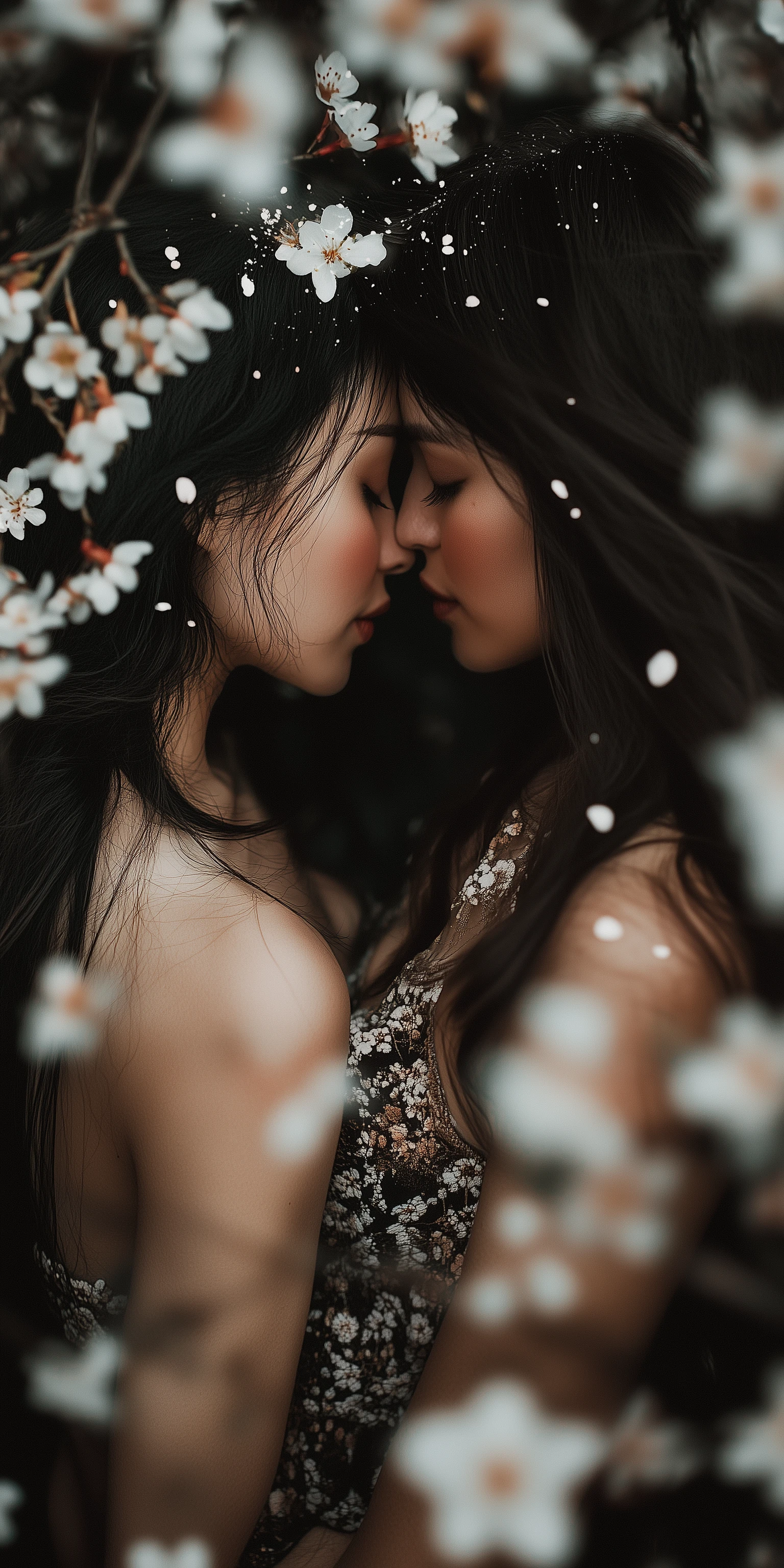 A photograph of two women with long hair, kissing each other, surrounded by white flowers and cherry blossoms against a dark background. The image is highly detailed, with sharp focus and high resolution, giving it a cinematic quality. The photograph was shot on a Canon EOS R6 Mark II camera, resulting in crisp, clear details. --ar 1:2 --style raw