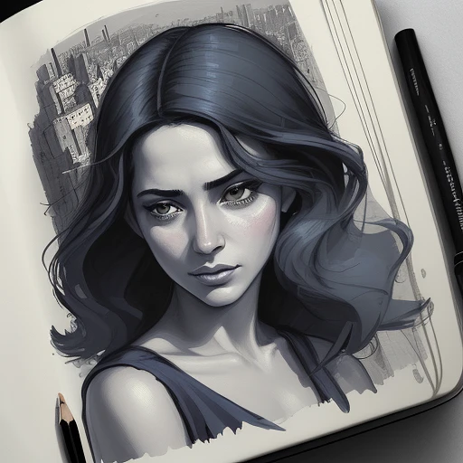 drawing of a beautiful woman in a portrait sketchbook, in the style of dynamic expressionist style, ahmed morsi, city portraits, benoît-hermogaste molin, emotive figurative works, indigo and gray, free brushwork --ar 68:128 --stylize 750 --v 5. 2