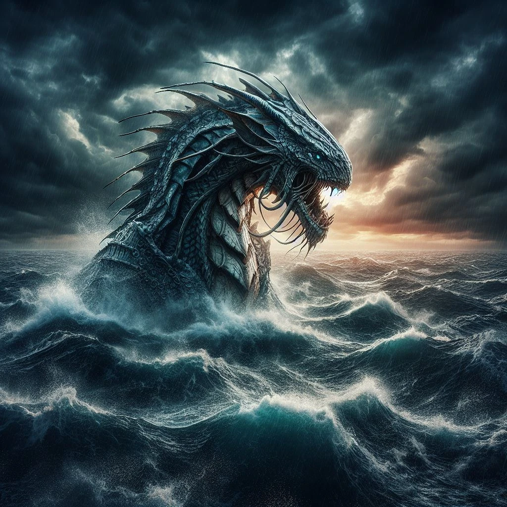 On the edge of a vast, storm-tossed sea, Leviathan, a fearsome and majestic sea monster, rules the depths with unmatched power and grace. The dramatic, ever-changing light of the stormy skies and the deep, dark waters casts deep, dynamic shadows on his intricate, scale-covered form, revealing the subtle, bioluminescent patterns that mark his deep connection to the primal forces of the ocean and his unrivaled mastery of the underwater realm.