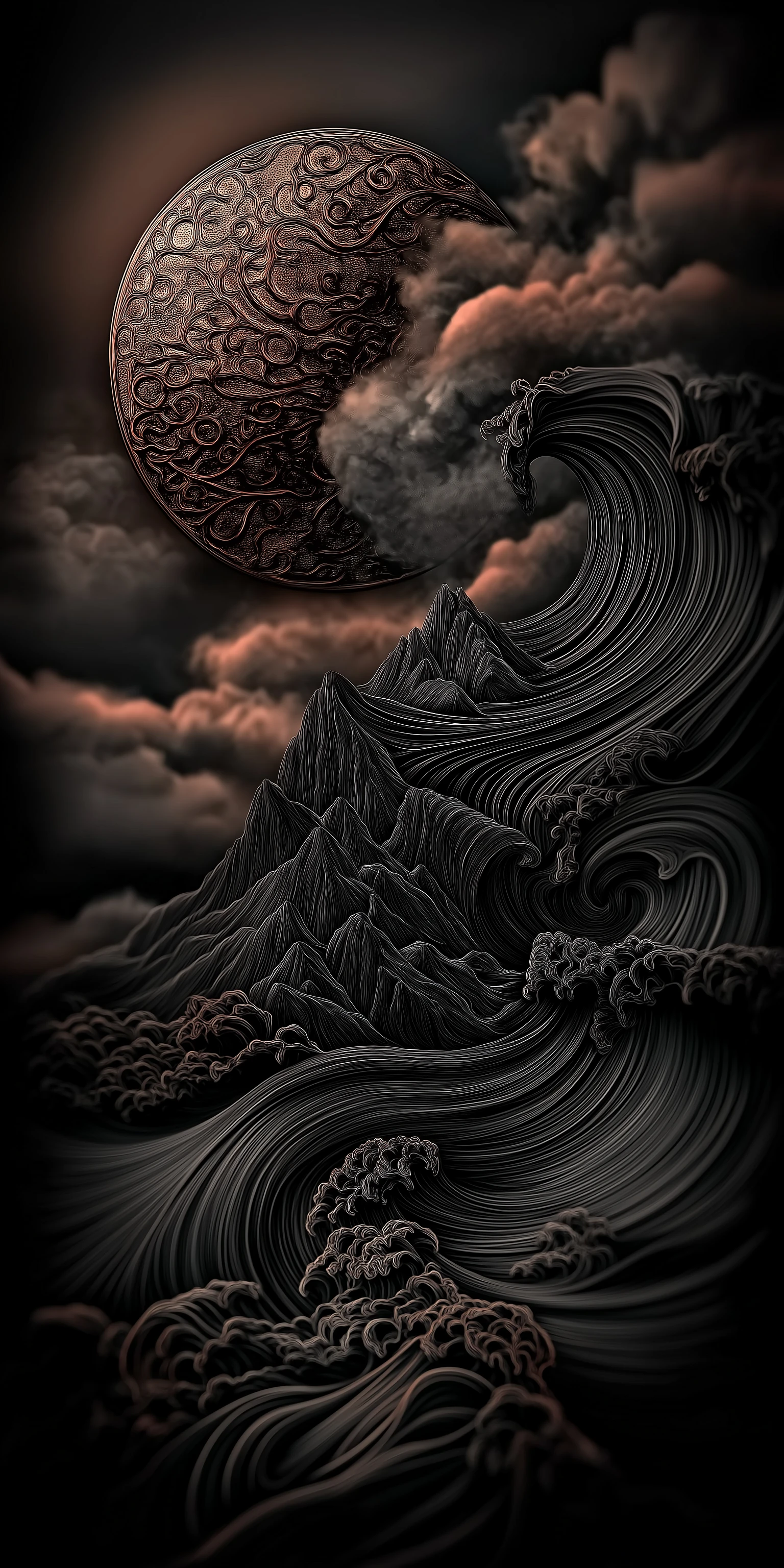 A dark fantasy illustration of an ocean with rolling waves, the sky is filled with swirling clouds and the moon in full view, a mountain range looms in the background, intricate details, digital art style, vector graphics, dark tones, high-contrast lighting, surrealistic atmosphere, shadows and highlights, in the style of Japanese ink painting techniques. --ar 1:2 --style raw --v 6. 1