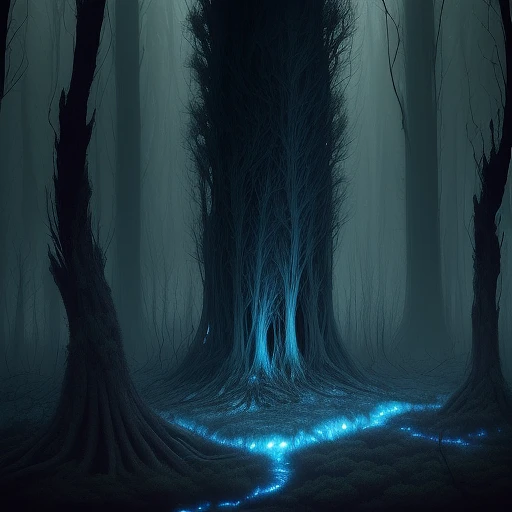 a illustration in style manga of An eerie forest overtaken by radiotrophic fungi, towering fungi with dark, covering the ground in dense growths. Dead trees are enveloped by fungi, which emit a faint blue luminescence. The overcast sky casts a somber light, with beams of radiation illuminating patches of glowing fungi, the scene is desolate yet eerily resilient