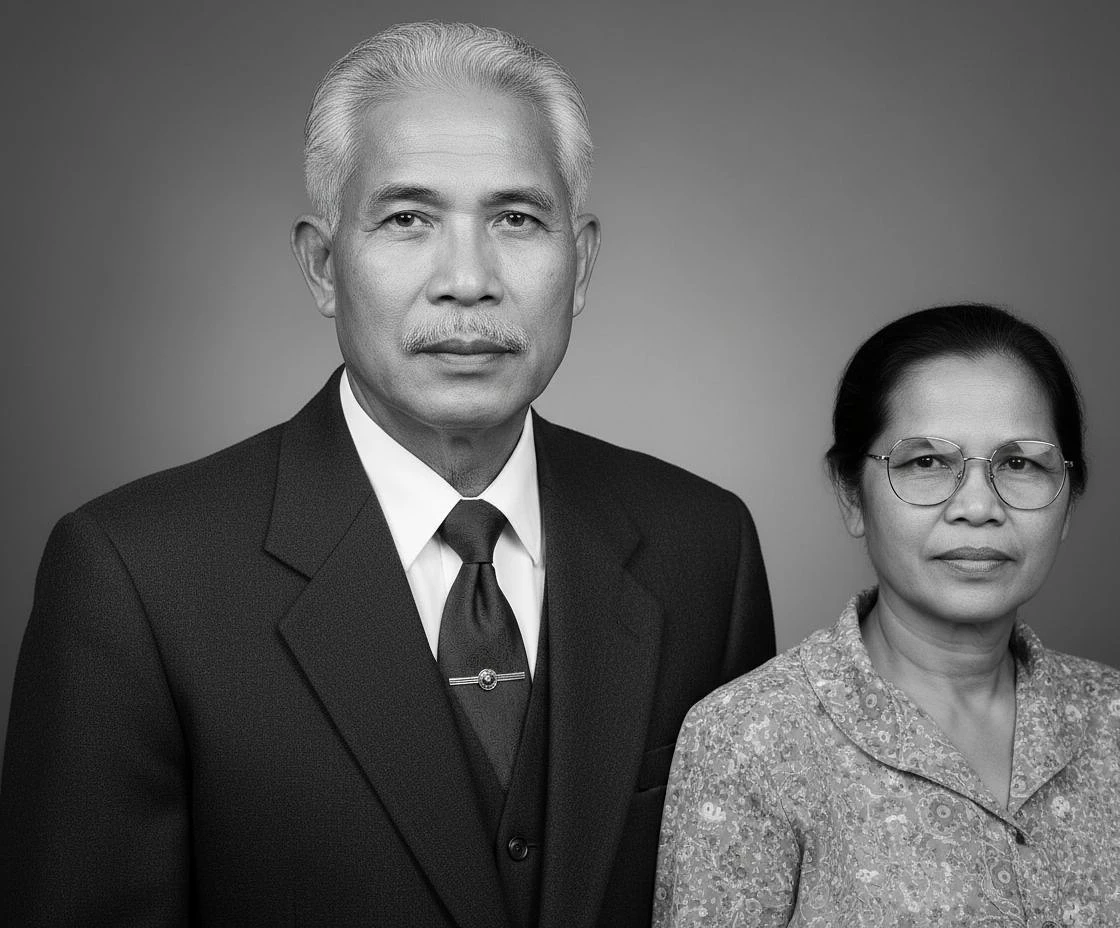 Re created from Image provided Type: Digital photograph, formal portrait Couple. Overall Photographic Style: Photorealistic, high-resolution, sharp focus on the subject's face, professional and classic portraiture. The style emphasizes clarity, detail, and a timeless quality. Lighting: Soft, even, and diffused lighting. The main light source appears to be from the front-left, creating subtle highlights on the forehead, cheekbones, and the top of the hair. There are gentle, soft shadows on the right side of the face, defining contours without being harsh. The overall illumination is balanced and natural. Depth of Field: Shallow to moderate depth of field. The subject's face and upper body are in sharp focus, while the background is subtly blurred, providing a soft, indistinct backdrop that keeps the focus entirely on the subject. Color Palette: Monochromatic (black and white tones) . The image exhibits a rich grayscale range, with deep blacks in the suit, bright whites in the hair and shirt collar, and a full spectrum of nuanced mid-grays, contributing to a sense of depth and texture. Subject Details: Age: Middle-aged to elderly man, appearing to be in his late 40s to 60s. Expression: Serious, direct, and intelligent gaze. His eyes are fixed straight ahead, conveying a sense of focus and possibly deep thought. There is no discernible smile. Face Shape: Oval to slightly rectangular, with a broad forehead and a prominent jawline. Hair: Neatly combed and parted on the left side (from the viewer's perspective) . It is thick and appears to have a slight wave or volume, especially towards the front. Hair Color: Light-colored hair, appearing white or very light gray in this grayscale image. Hair Style: Short to medium length, combed back from the forehead on both sides, with a clear side parting. Eyes: Appears to be light-colored (possibly blue or grey, given the grayscale) . They are almond-shaped with well-defined eyelids, and appear to be deep-set. Eyebrows: Medium thickness, relatively straight, and also light-colored (white/gray) , matching the hair. Nose: Straight, prominent, with a well-defined bridge and nostrils. Mouth and Lips: Hidden mostly by a thick mustache. What is visible of the lips appears thin and set in a firm line. Chin: Broad and rounded, with a slight cleft or dimple visible in the center. Distinguishing Features: A prominent, thick, and well-groomed mustache that extends horizontally beyond the corners of his mouth. Body and Clothing Details: Pose: Upper body portrait, showing the head, shoulders, and upper chest. The subject is angled slightly to the right (from the viewer's perspective) , with his head turned to look directly forward. His posture is upright and formal. Clothing: Dressed in a dark, formal suit jacket, likely made of wool or a similar textured fabric. Beneath the jacket, a light-colored collared shirt is visible, with a dark, perhaps patterned, necktie fastened with a decorative tie pin or clasp. A dark waistcoat might be partially visible under the jacket. Background: A plain, solid-colored backdrop, likely a medium gray or dark neutral tone. It is uniformly lit and appears smooth, without any patterns, objects, or discernible features, ensuring the subject is the sole focus. Overall Mood/Atmosphere: Formal, dignified, intellectual, serious, and classic. It evokes a sense of authority and academic presence. Maintain the detail and originality of the image face.