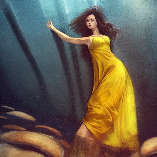 a portrait of an woman just under the surface or the water, yellow dress flowing in the current, angelarium, cinematic