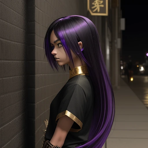 side view emo beautiful tan skin girl. gold eye iris. black shirt. lnog purple hair black highlights in hair. stand at a side-walk back against a wall. looking at the ground. at night. holding a giant gold Ji spear. right handing Ji spear.