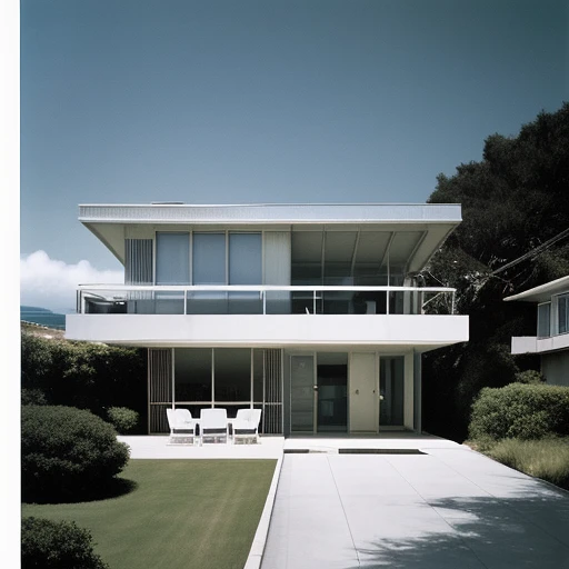 Hyper realistic eye level exterior photo of a mid century modern style house overlooking the ocean, daylight, indirect lighting, AD magazine, Frank Lloyd, Eames, Mies van der Rohe