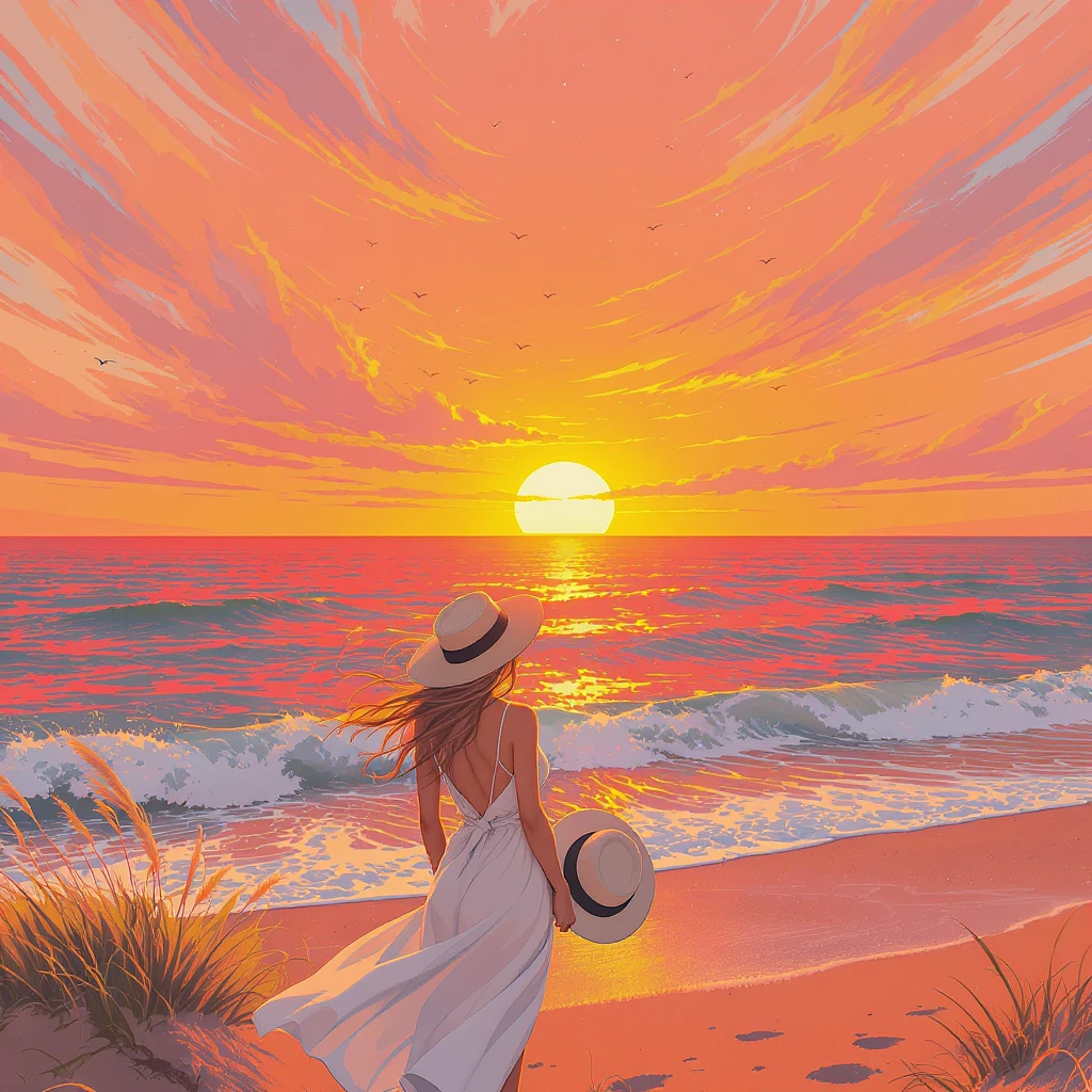 dessin animée femme élégante portant une casquette marine, se tenant sur le bord d'une plage. En arrière-plan, un magnifique coucher de soleil éclaire le ciel de teintes chaudes, allant du jaune doré à l'orange profond, se reflétant sur les vagues douces de l'océan. La femme, les cheveux flottants au vent, admire le paysage, ajoutant une touche de sérénité à la scène. Les détails comme les mouettes volant au loin et les dunes de sable complètent l'atmosphère paisible de cette fin de journée. "