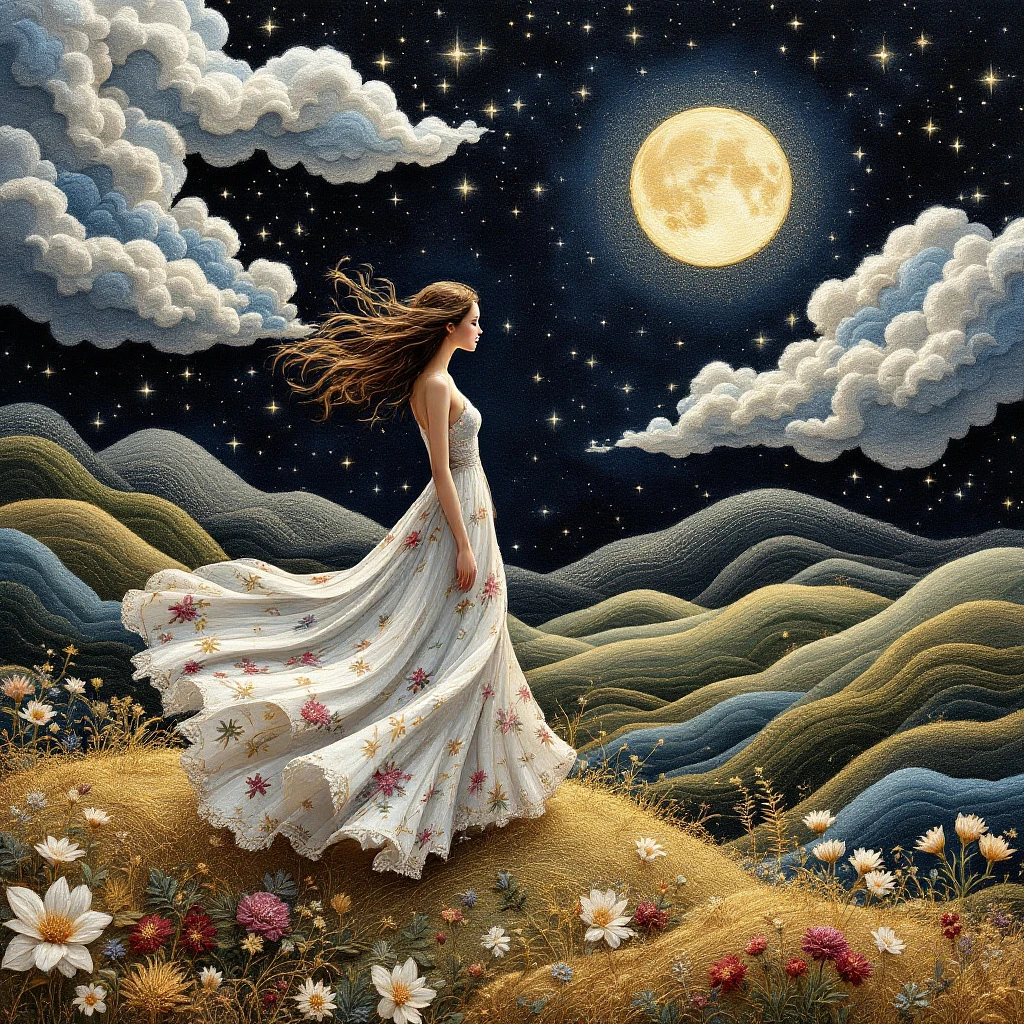A delicately embroidered artwork depicting a serene female figure standing on a hill under a night sky, surrounded by swirling embroidered clouds and a glowing full moon. Her flowing dress is detailed with floral patterns and golden threads, fluttering gently as if in motion. The scene is crafted entirely in the style of embroidery art, with rich textures, layered fabric stitches, and vibrant threadwork. The background features gently rolling hills and a starry sky, all rendered in intricate textile detail, evoking a magical, dreamlike atmosphere. in the style of Embroidery --v 5. 2