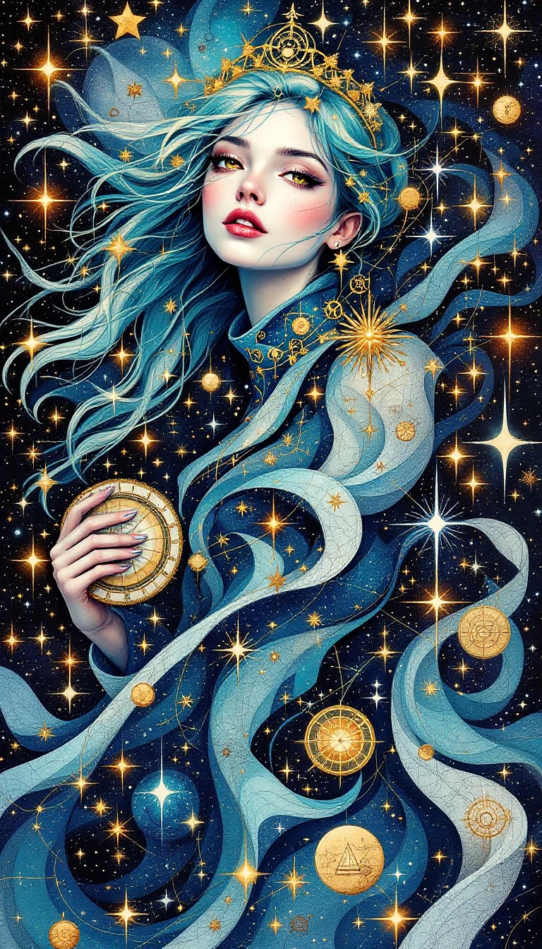 "Aquamarine Navigator in a Sea of Shifting Stars": A mesmerizing abstract painting depicts a navigator, exhibiting both poise and a strong connection to the cosmos. She is a skilled explorer of the astral seas, shown within a plane where constellations shift and transform around her, with fair skin, long, flowing aquamarine hair that seems to drift with the currents of the universe, and a flowing, layered outfit with celestial maps and glowing symbols. Sextants, telescopes, and other navigational instruments are woven into her clothing and are held in her hands. The artwork blends contemporary abstraction with a figure study, creating a serene and wondrous scene using colors such as blues, silvers, and purples. Her serene, amber eyes, the composition's focal point, convey both wisdom and a deep connection to the stars. After a long night spent charting the vastness of space, the navigator embodies both knowledge and a sense of timeless exploration. The dynamic colors and detailed patterns invite the viewer to discover the hidden tales within this vibrant artwork presented as a painting.