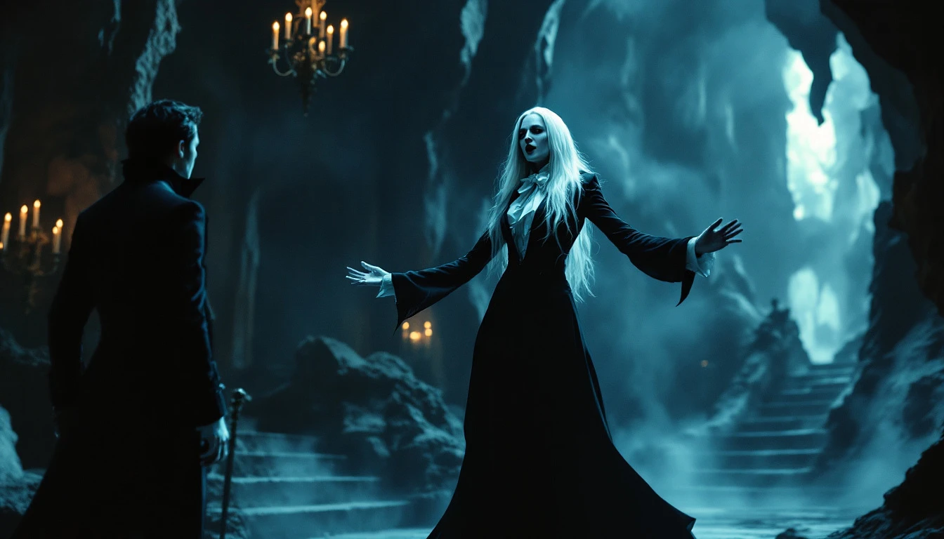 phantom of the opera, Woman, tall, slender, long legs, long white hair, right side of face is severely scarred, she wears a fitted tuxedo, white shirt and white bow tie, long flowing black skirt four inch black stilettos are visible, she sings in an operatic style, arms wide, in a gothic lair , cave with a large pipe organ. extreme wide to show entire body. A handsome man in nineteenth century formal wear stands ten feet behind her mesmerized by her singing.