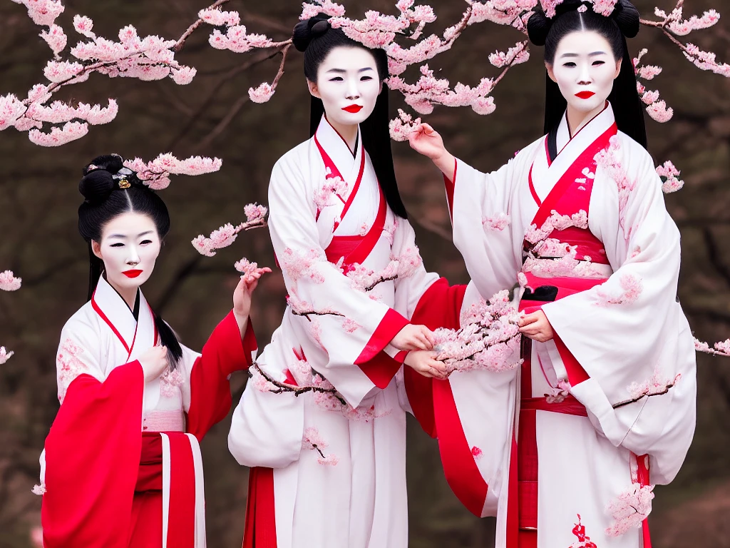 A woman from China, dressed in traditional Hanfu, with her hair combed into a delicate bun and adorned with exquisite cherry blossoms. Her face was painted with a porcelain like finish, her bright red lips and black lined eyes evoking a sense of mystery and charm.