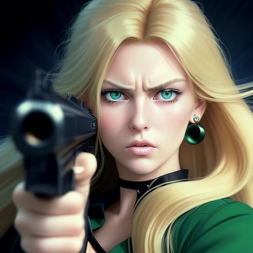 A close-up of a beautiful blonde woman with long hair and piercing green eyes in the style of 1980s anime, holding a handgun in her right hand and aiming directly at the viewer. Her expression is serious and intense, with her mouth slightly open as if she's about to speak. The dark background contrasts with a bold blue banner behind her, emblazoned with the word 'COBRA' in striking letters. The overall tone is tense, ominous, and reminiscent of retro anime, with a hint of parody.