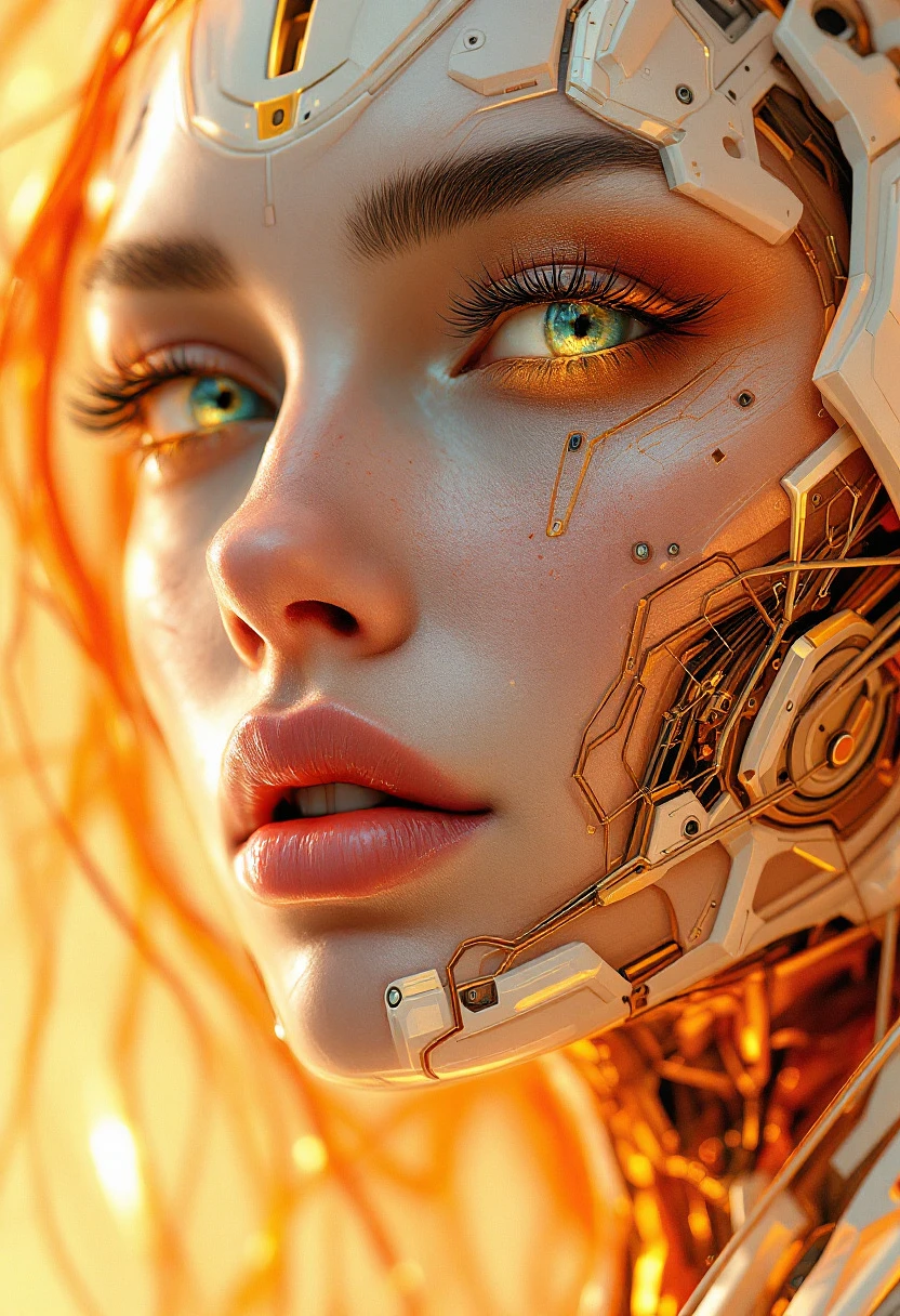 Bust of a female cyborg. Beautiful, artful brush strokes and lines that convey emotion in a beautiful portrait style. Eyes and lips in orange tones. Digital Art. Perfect composition. Incredible detail and beautiful rendering. Trending on ArtStation. 8k Fine Art Photography. Realistic concept art. Perfect light in natural volumetric cinematography. Soft light and shadows. Award winning photography. Masterpiece. Oil on canvas. Raphael Caravaggio. Greg Rutkowski. Beeple Beksinski. Giger.