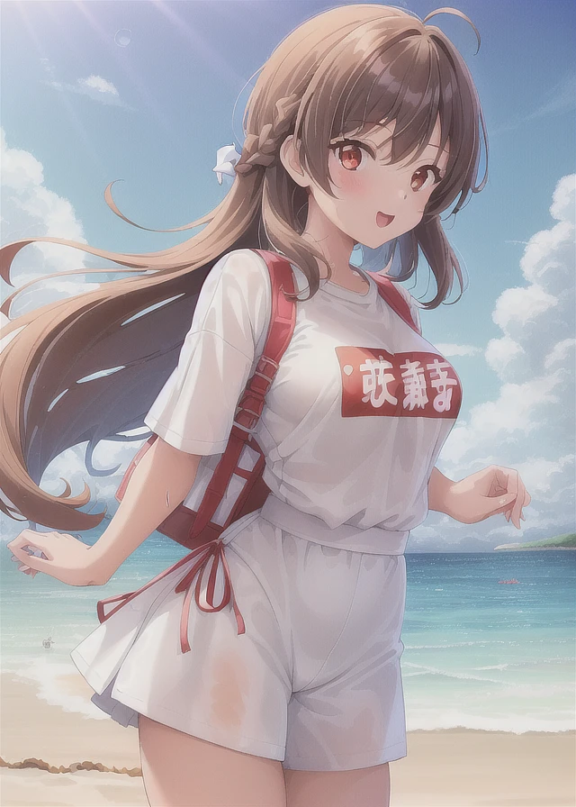 1girl, perfect anime illustration, happy, very closeup painting, knotted braid, best brown girl hair, pretty woman as a lifeguard, white lifeguard tower, beach, summer, outdoors, bright sun, white shorts, red plain t-shirt, ocean, sand, lifeguard, paradise, cute, casual outfit, aesthetic. (best quality:1.2) , animated lighting, octane render, bright mood, walking alone, fashion, anime, masterpiece, trending, detailed fanart, anime faces, dynamic pose