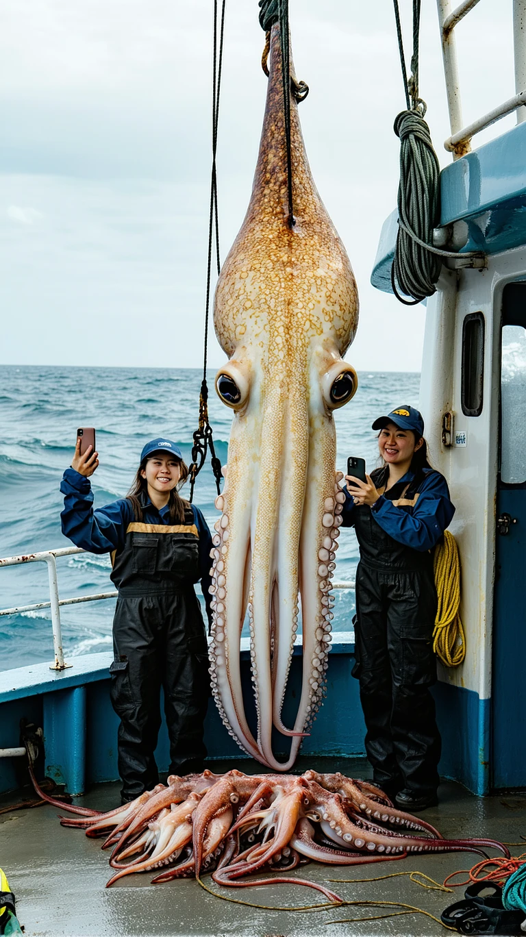 A full-length photograph of two female fishermen on a fishing boat with a giant squid. The giant squid is huge, spanning the entire width of the boat. The head of the giant squid looks like a person. The giant squid is hanging on a fishing net. Two female fishermen are standing around the giant squid, and one of them is taking a selfie. Fishing gear is in the background. many dead squid on the floor of the boat