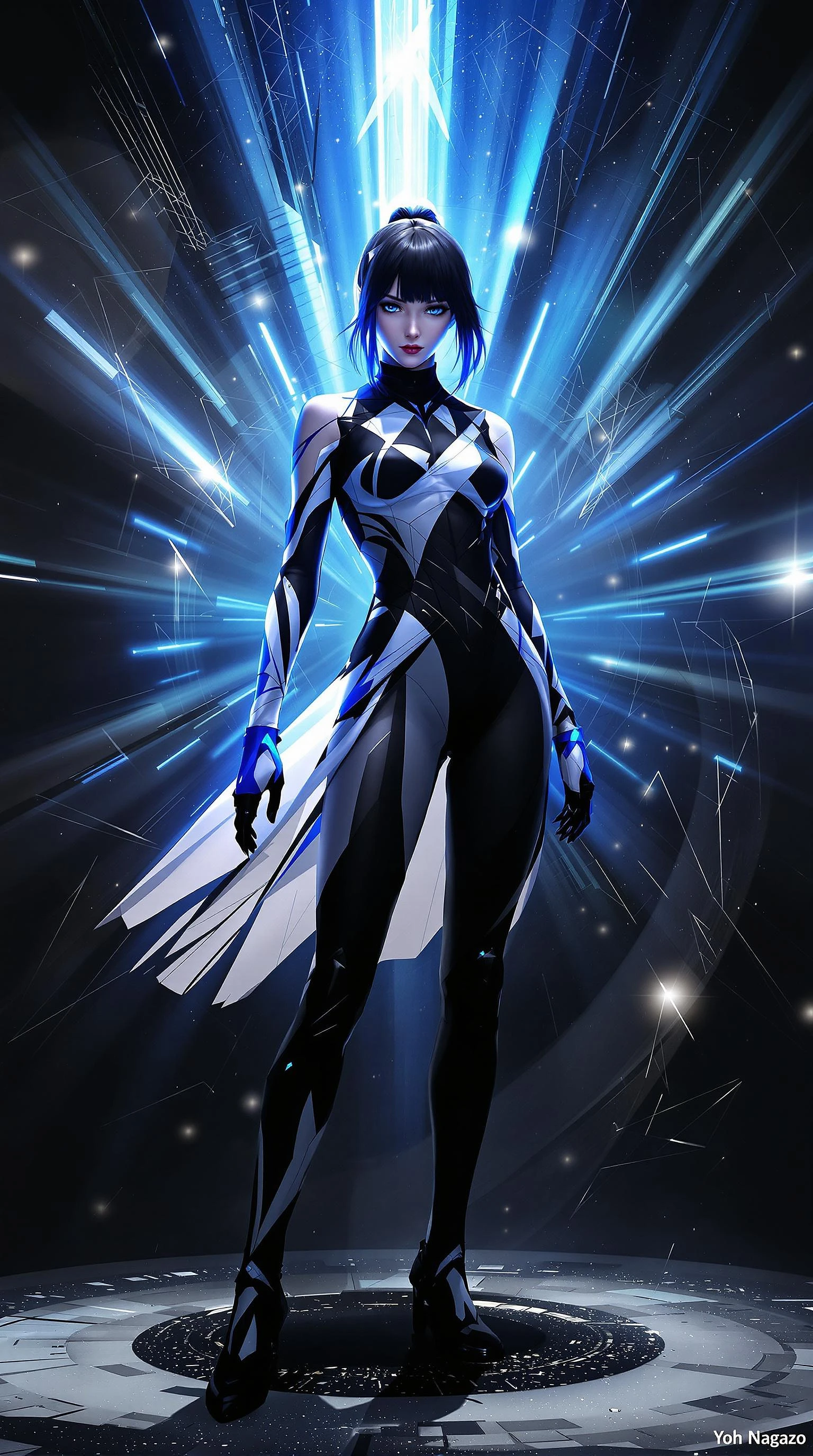 Movie poster featuring a female character in a striking palette of black, white, and blue, in the style of Yoh Nagao, with a focus on dynamic lighting. The woman stands confidently in the center, her figure highlighted by sharp contrasts and vibrant blue accents. Her attire combines sleek, modern elements with artistic patterns reminiscent of Yoh Nagao's work, creating a visually engaging look. The background features abstract, light-focused designs, with beams and flares that emphasize her powerful presence. The overall composition is bold and dramatic, capturing both the intensity and beauty of the character, perfect for a thrilling, visually stunning film --ar 71:128 --stylize 750 --v 6. 1