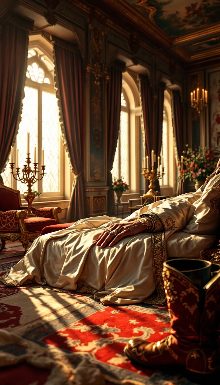 First person POV, the Sultan slowly awakens in his grand bedroom within the Ottoman palace. The sunlight pours gently through large, ornately decorated windows, casting warm light onto the rich, patterned carpets and luxurious furnishings. The Sultan’s hand, adorned with several exquisite Ottoman rings, rests on the silk sheets as he stretches, feeling the softness of the fine fabrics. His room is filled with lavish details: golden candelabras flicker softly in the morning light, and the scent of fresh flowers from nearby vases fills the air. The walls are lined with intricate tapestries, and the ceiling is painted with scenes of imperial victories. His velvet robe, embroidered with gold, lies neatly on a chaise longue beside his bed. His boots are visible at the foot of the bed, waiting to be worn as the day begins. The soft murmurs of palace attendants can be heard from outside, preparing the Sultan’s court for the day ahead. --ar 9:16 --s 250