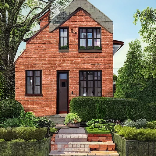 hyper realistic eye level exterior photo of a brick house house, daylight, indirect lighting, sidewalk, cozy, magazine exterior photo, better home and garden, large windows leading to garden, heavy inviting doors, roof lined by gutters, Victorian