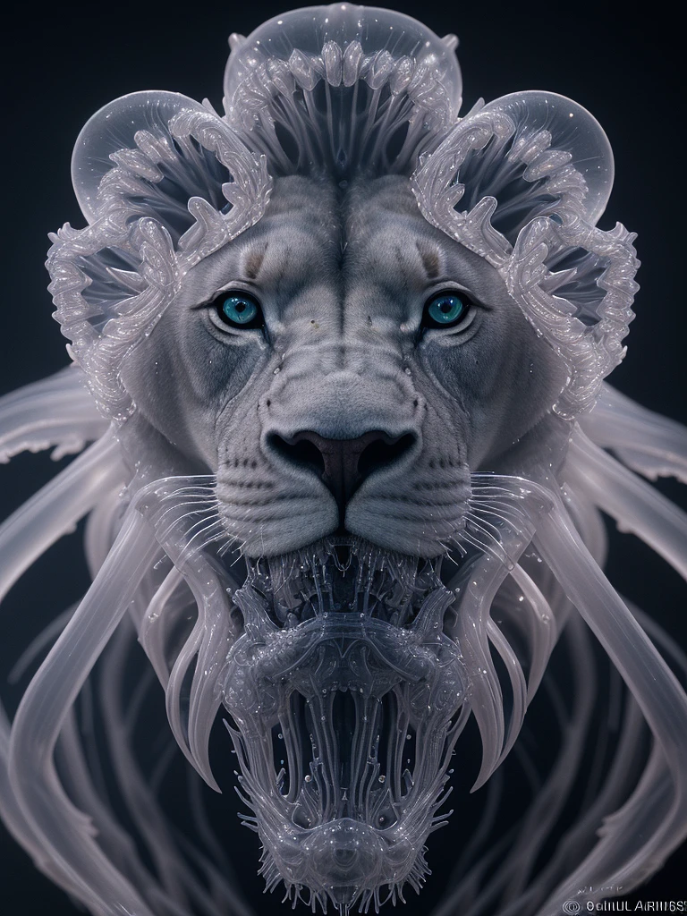 lion close-up portrait ribcagel. jellyfish symmetrical head, bioluminiscent scriptures, intricate artwork . octane render, trending on artstation, t symmetrical artwork. cinematic, hyper realism, high detail, octane render, 8k