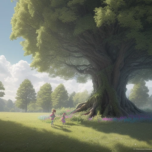 Children and girl seetdown, tree epic on the background, clouds bright, tree green. Day. sun bright. Colorful, Detailed, 4k, Ultra Hd, Realistic, Vivid Colors, Highly Detailed, UHD Drawing, Perfect Composition, Beautiful Detailed Intricate Insanely Detailed Octane Render Trending On Artstation, 8k Artistic Photography, Photorealistic Concept Art, Soft Natural Volumetric Cinematic Perfect Light, lake blue crystal, mounteins tiny,