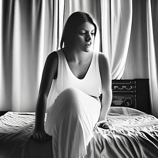 A black-and-white photograph of a beautiful woman kneeling gracefully on a bed, her body turned slightly to the side in an intimate, elegant pose. The soft natural light filters through sheer curtains in the background, casting gentle shadows across the room and creating a serene, glowing ambiance. Her long hair falls loosely around her face and shoulders, catching the light delicately. The background features a minimalist bedroom with soft, flowing fabrics draped around the window, contributing to the peaceful and airy atmosphere. The texture of the sheets and fabrics is subtly visible, adding a layer of depth to the composition. The overall mood is serene, intimate, and sensual, with the contrast between light and shadow highlighting the natural curves of her body. The high-resolution image has a film-like grain, lending the photograph a timeless, analog feel
