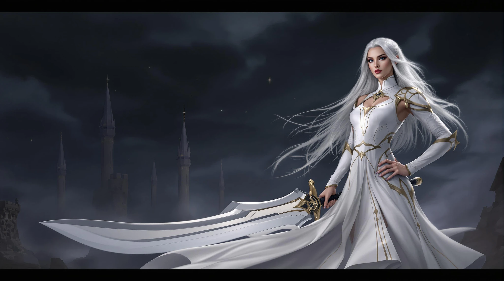 a woman in a white dress holding a sword, with a fantasy landscape in the background. The woman has long, flowing white hair and is wearing a white dress with gold accents and a high neckline. She is holding a large sword in her right hand, with the blade pointing downwards. The sword has a gold hilt and a long, curved blade. The woman is standing in a dramatic pose, with her left hand on her hip and her right hand holding the sword. The background of the image is a fantasy landscape, with tall spires and towers rising up into the sky. The sky is dark and cloudy, with a few stars visible. The overall effect of the image is one of drama and fantasy, with the woman in the white dress and the sword being the central focus of the image.