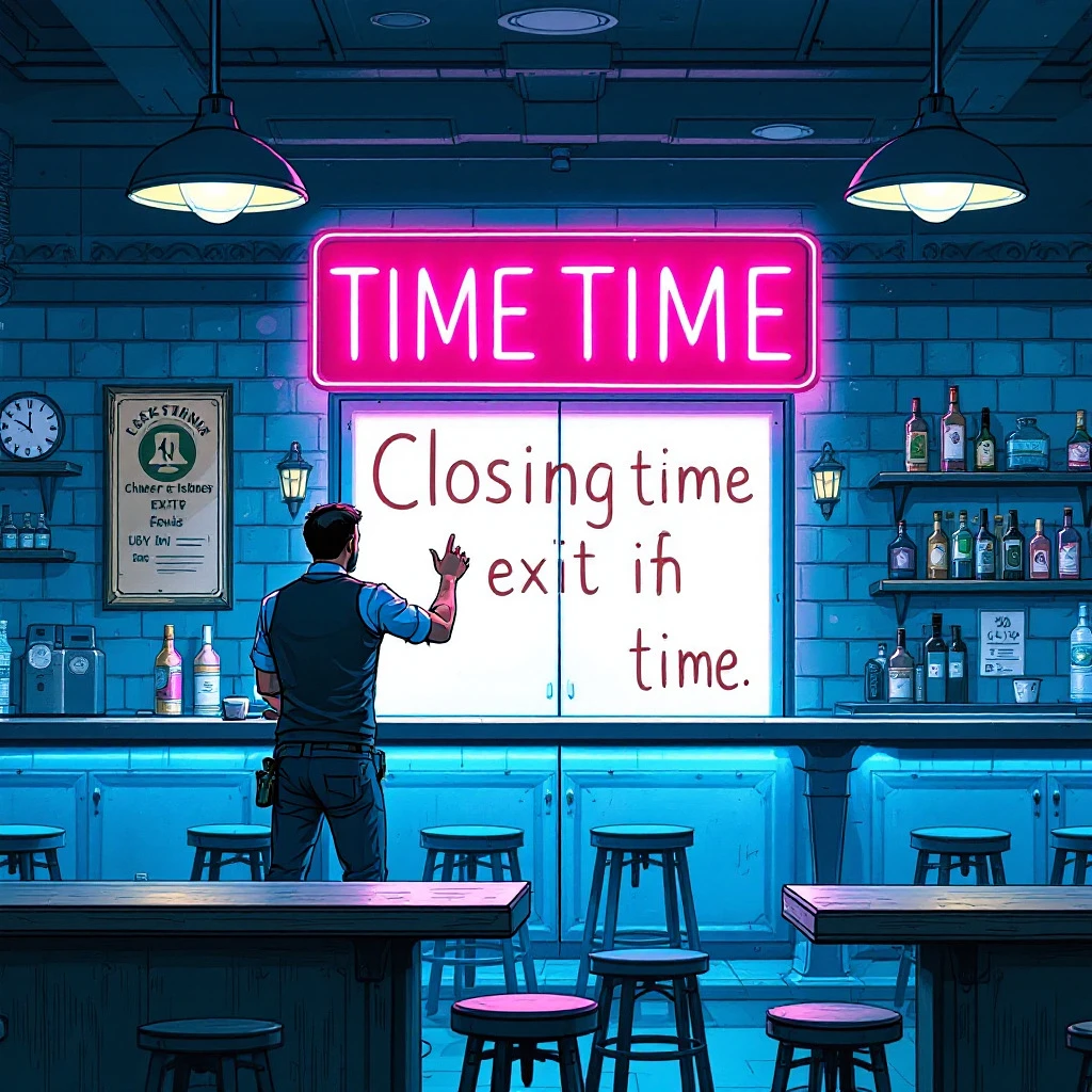 closing time at a bar, with a big exit sign lit up over the exit doors, a bartender putting the stools upside down on tables.