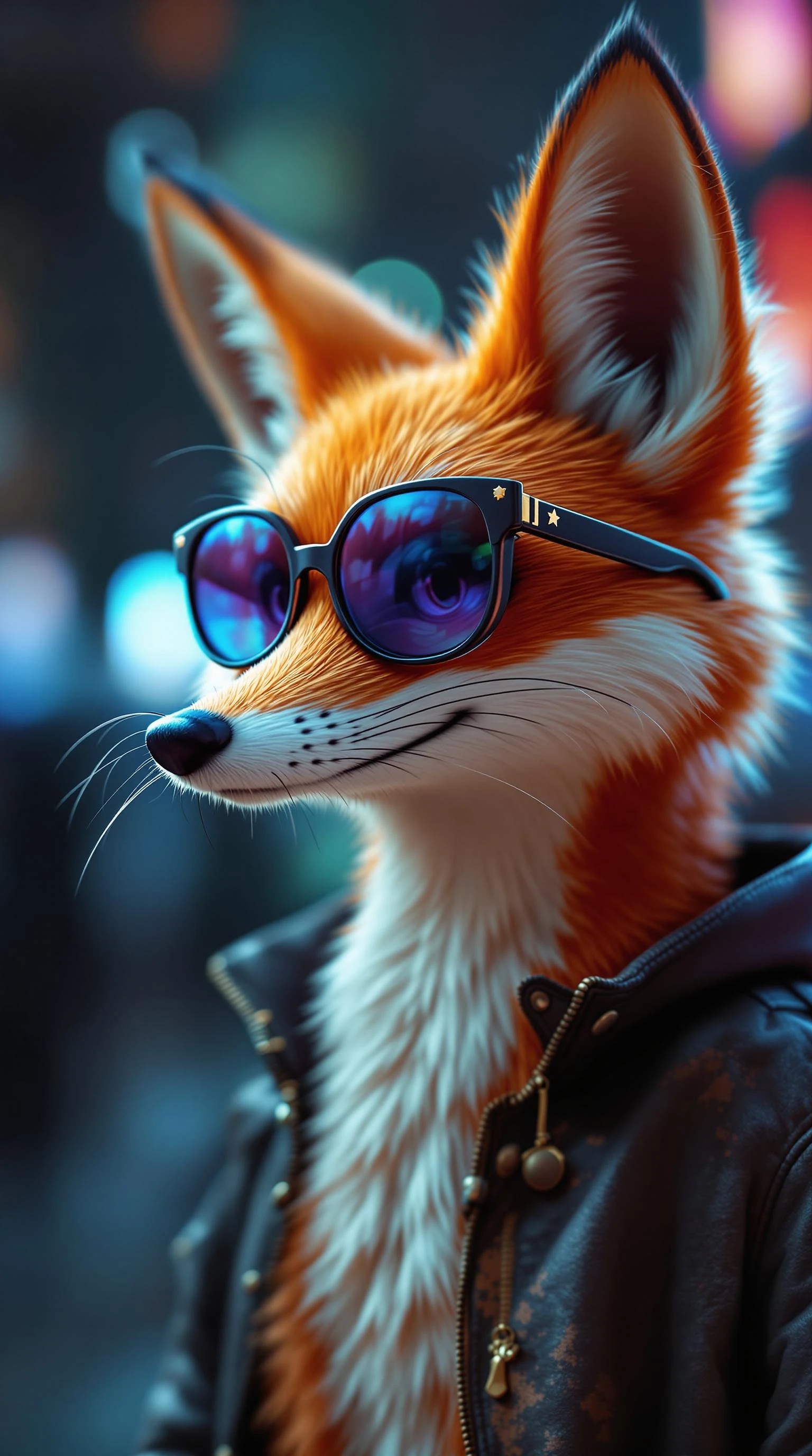 portrait of a cartoon fox wearing sunglasses, in the style of vray tracing, neonpunk, photo-realistic techniques, konica big mini, detailed costumes, colab, cold and detached atmosphere, 8k, sharp focus, ultra highly detailed, --ar 2:3 --s 750 --q 2 --v 5