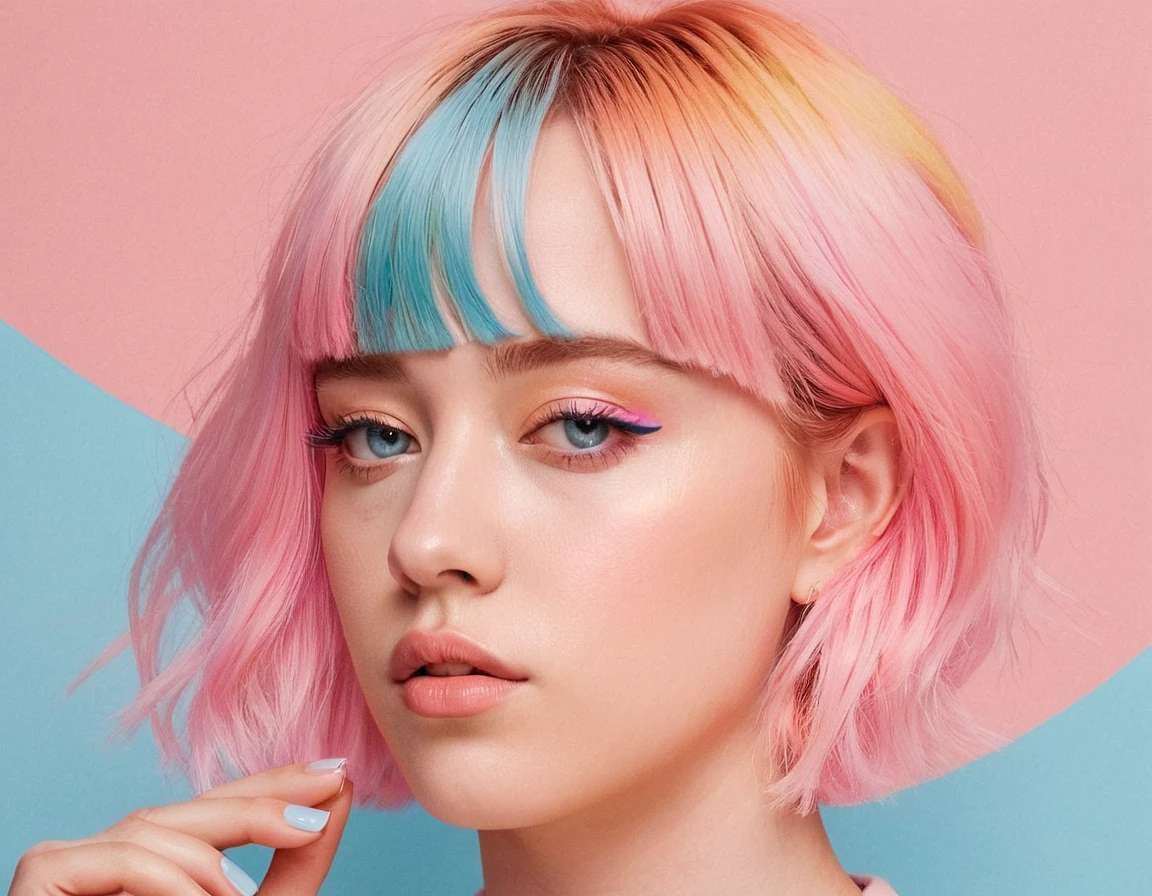 A close-up of the face of a person, channeling the essence of Billie Eilish, featuring a somber and stoic expression. Their hair is in soft pastel blue, skin takes on a gentle pastel pink hue, and eyelashes dazzle in pastel yellow, presenting a psychedelic palette. The artwork merges elements of risograph printing and anime, echoing the exquisite detail and emotional depth reminiscent of James Jean's work. Set against a tranquil pastel pink sky, this flat illustration combines a unique blend of styles in a riso print-like appearance. in the style of James Jean fused with uranium glass aesthetic