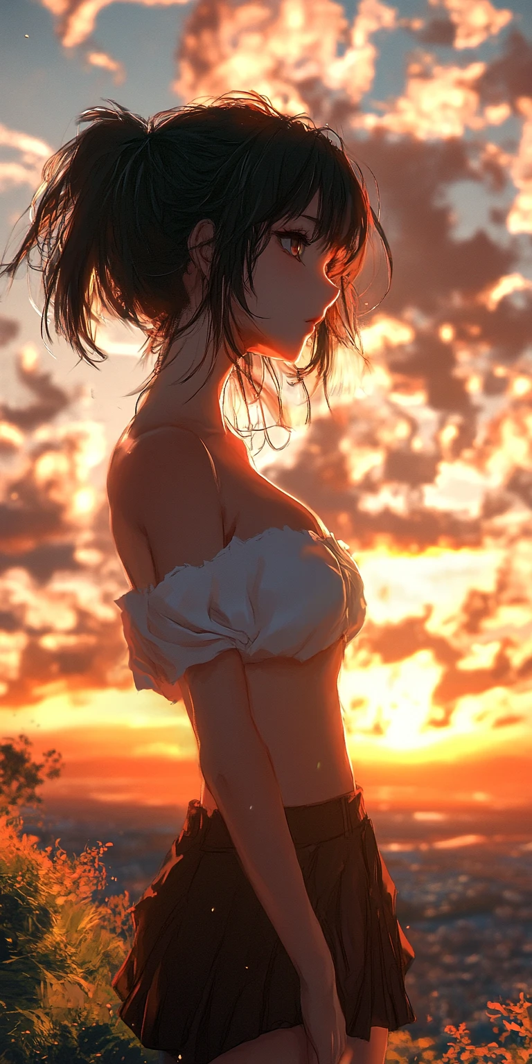A beautiful girl with black hair stands on the mountain overlooking the scenery, her eyes closed as she gazes into the distance. Creating a soft glow that illuminates it. --chaos 5 --ar 1:2 --style raw --v 6. 1 --stylize 150