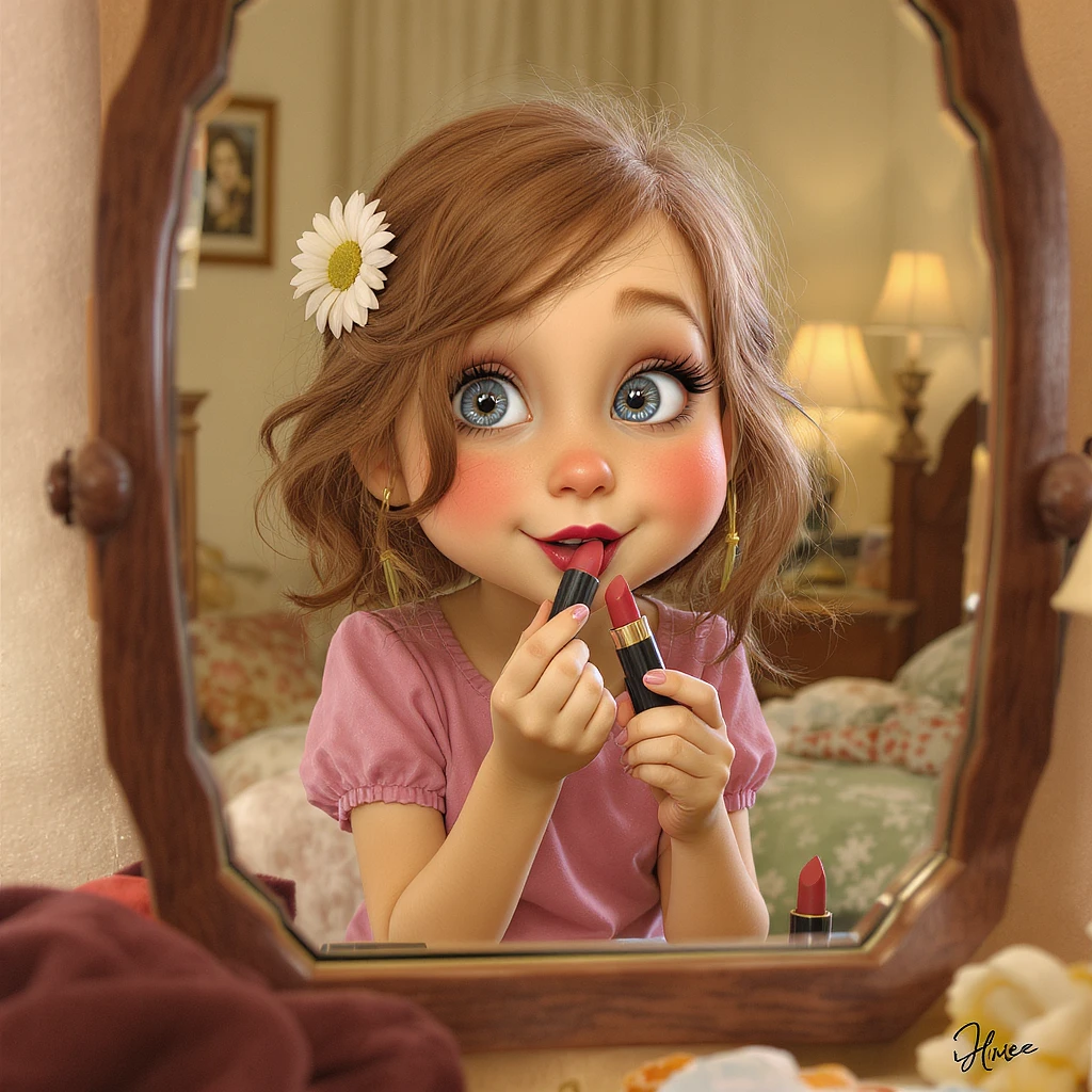 Caricature. whimsical, little lady, playing with moms lipstick, looking in the mirror while putting it on her lips, looking at the viewer, she has blue eyes, brown hair, a daisy in her hair, pink dress, bg is moms bedroom, detailed,