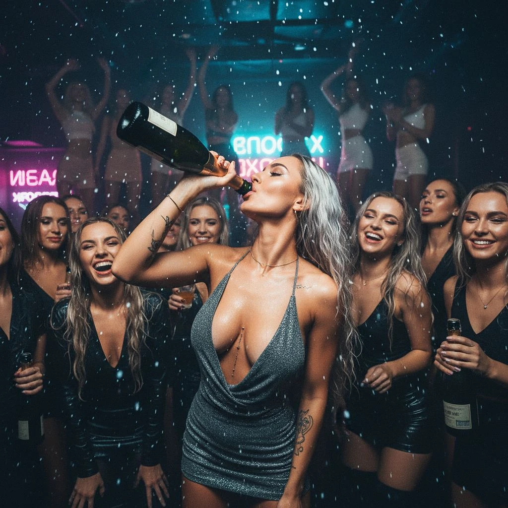 GRAINY CANDID CANDID NIGHTCLUB STYLE PHOTOGRAPHY shot of a huge group of wild sexy 23 year old Russian women IN VIP WILDLY DRINKING SPRAYING CHAMPAGNE ALL OVER THE ROOM VISIBLY WET FROM THE CHAMPAGNE WITH a big group of EQUALLY GORGEOUS FRIENDS they all have a beautiful face that has had cheek bone surgery, lifted brow surgery , Botox lips, nose job, ultra modern beauty look wavy blonde and steaks of white/grey wild hair . Standing in a dimly lit night club with many Victoria secret looking beautiful women dancing all around our subject it is dimly lit with neon lights and signs everywhere. She has a flirty gorgeous deep plunging nightclub attire with deep plunge exposing her very large perky lifted cleavage. She has multiple piercings under poking through shirt, stylish feminine jewelry and glamour bottle service type fashion and has trendy cool tattoos. She is WILDLY DRINKING AT THE BAR with her equally as beautiful friends Picture is extremely clear