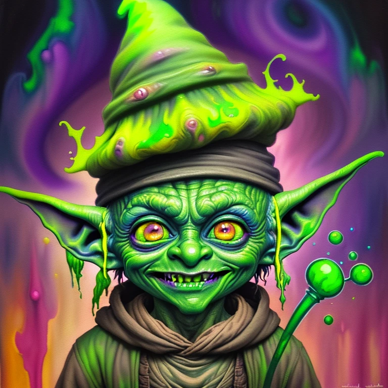 Mistic goblin looks like Yoda with a hat in psychedelic mode, hat details, made entirely with professional oil watercolor, minute details of the face, background psychedelic matte colors, masterpiece, Splash , spiral, surreal, fantasy, smiling, clothes details insane, expresive eyes