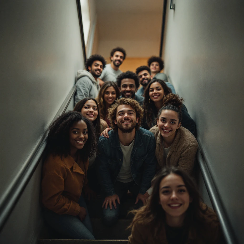 Photo of a ultra realistic 8 friends in a tight stairway, mixed race, men and women, facing the camera, happy, 4k, hyper realistic, focused, extreme details, unreal engine 5, cinematic, masterpiece, --ar 1:2 --stylize 750
