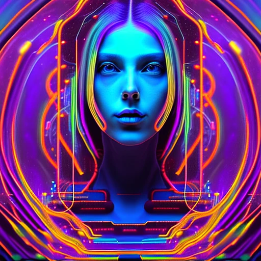 Abstract bioluminescent portrait of a determined beautiful woman with long iridescent hair, gritty swirling purple vibrant cybernetics, digital UI, abstract blocks, glitch art, hacking effects, glitch effects, digital tech effects, chromatic, color blocking! , octane, object-centered, oil on canvas, cyberpunk, symmetrical, Red, concept art, abstract, trending on art station