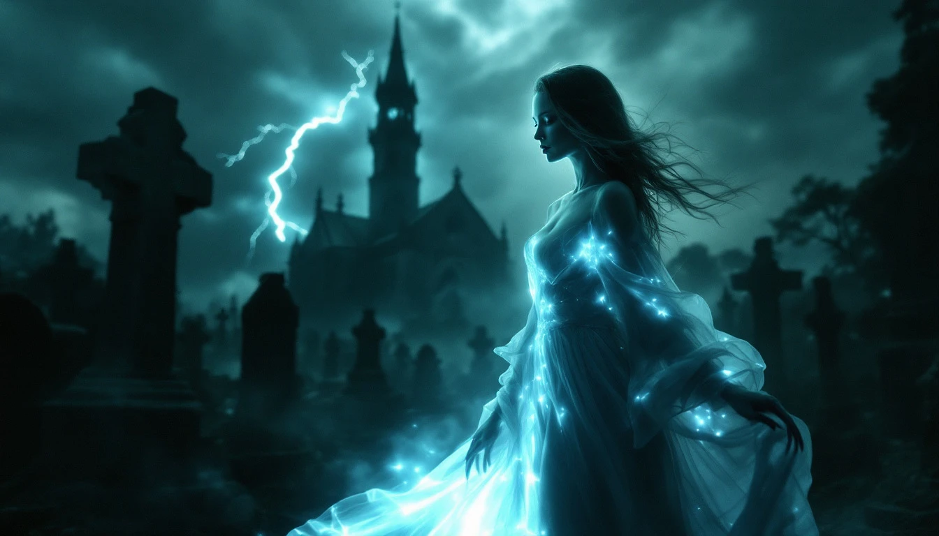 a hauntingly beautiful scene of an almost diaphanous transparent translucent ethereal woman in a graveyard, surrounded by the eerie atmosphere of a dark and stormy night. The woman has a glow about her that radiates a bright white off her alabaster skin, with long hair that blows in the wind, and she wears a flowing dress that complements her. Her attire is elegant yet somber, fitting for the mournful setting. The background is a wide-angle shot of a graveyard, with a large church looming in the distance. The sky is dark and cloudy, with lightning illuminating the scene. The atmosphere is ominous, with a sense of foreboding. The image appears to be shot with a wide-angle lens, capturing the vastness of the graveyard and the drama of the scene. The style is reminiscent of a Gothic horror movie, with the woman's pose and the lighting adding to the sense of drama and tension.