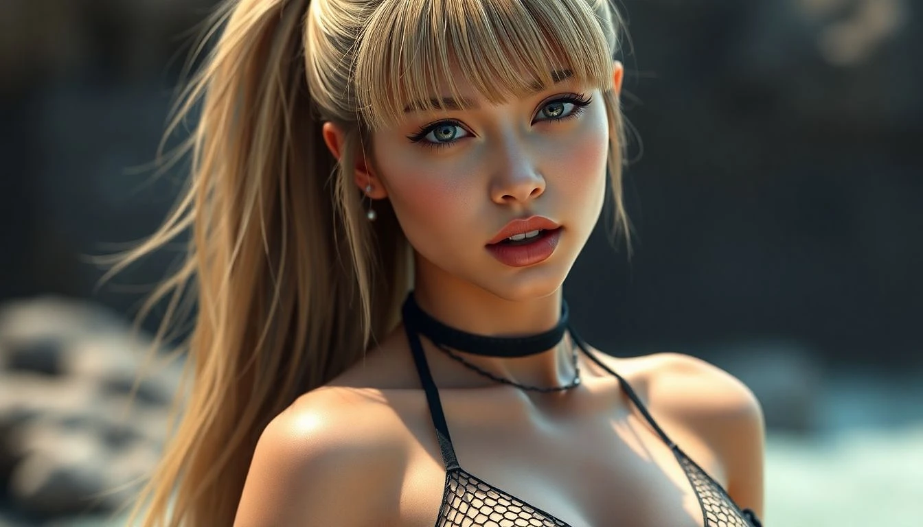 Brunette young, and blond bangs hair, ponytail, open mouth, Design a photorealistic image of a busty woman The fantasy character design should be in 4K concept art and hyper realism. Use detailed fishnet , micro mesh bikini