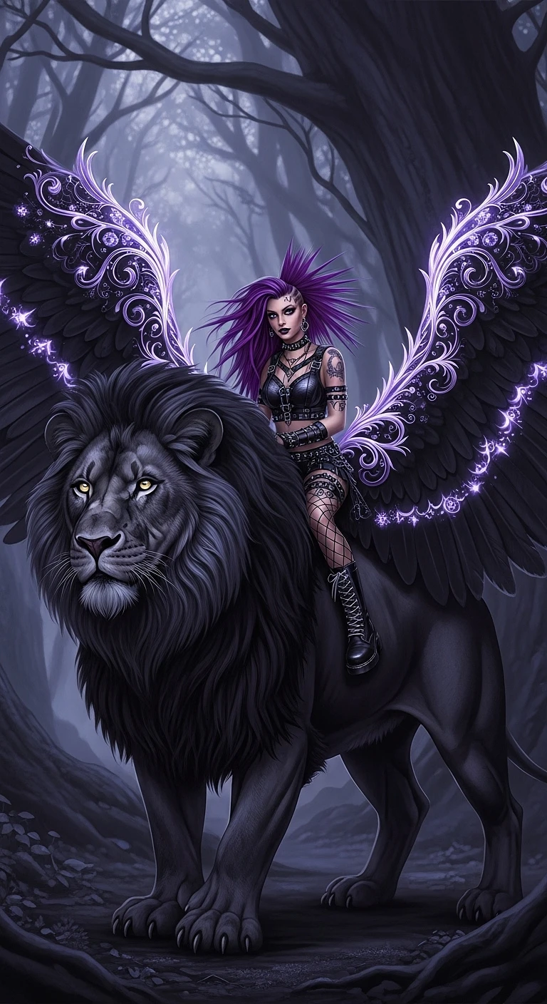A full body photo shot of an strong, fierce black lion with large outstretched, transparent-black feathery wings with intricate glowing filigree details. A punk rock woman with long flowing deep purple hair wearing combat boots and gothic style clothic with fishnet detailing and dark bold makeup sits on its back. Dark, moody, forest backdrop, large shadowy trees. Symetrical hyperdetailed texture, pearl filigree, deep violet, concept art, DeviantArt, perfect composition, masterpiece, glittering, professional photography, dramatic lighting, 8k, sharp focus, ethereal, dark fantasy, moody lighting
