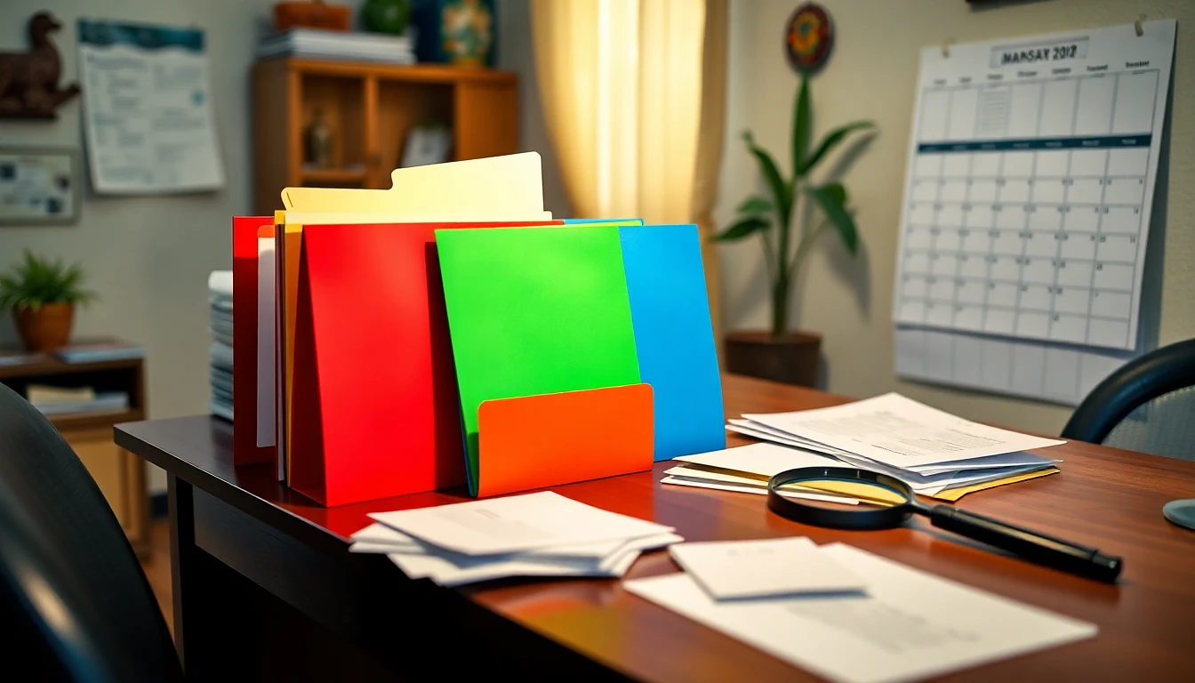 A realistic image showing a well-lit desk in a caribbean home. On the desk, we see a mail sorting system composed of four bright-colored folders or hanging files: A red folder A green folder A blue folder A yellow folder l Next to the folders, we can see some scattered envelopes and documents, as well as a magnifying glass and a large wall calendar. The ambiance is warm and organized, with a touch of tropical decoration like a small plant or a Martinican craft object. The lighting should be soft but sufficient for good visibility, adapted to seniors' needs.