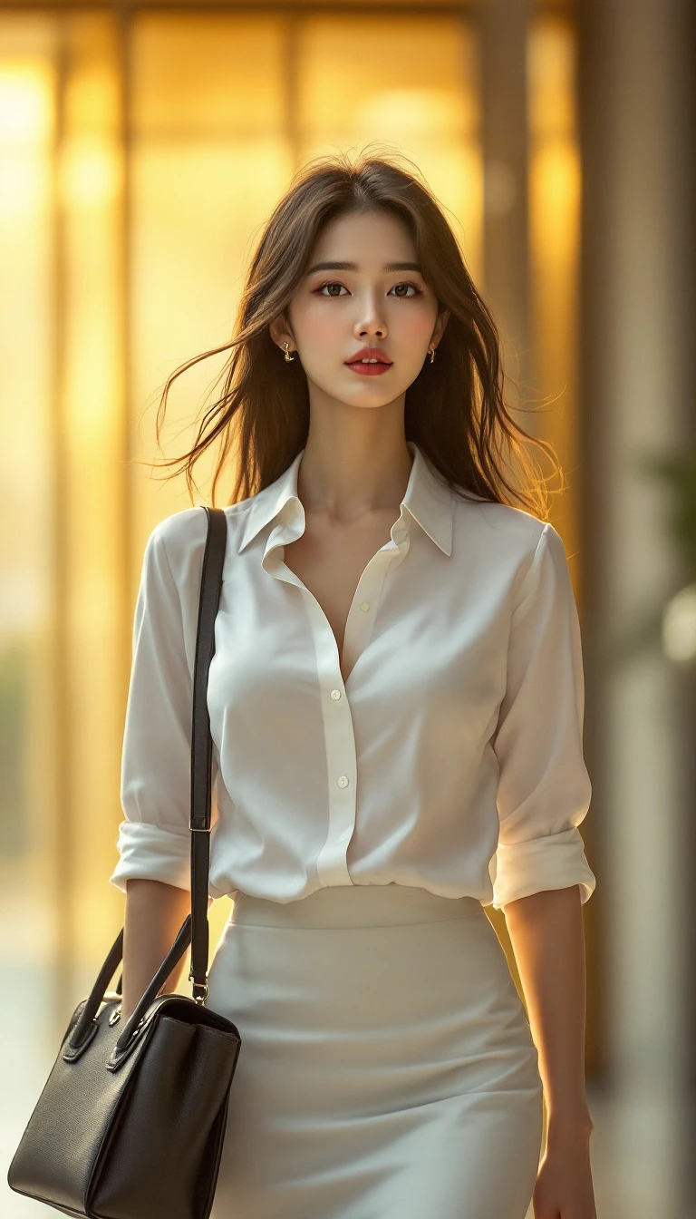 photograph, asian korean girl woman walking, knee shot, wearing a modern business white color shirt, pencil skirt, large_breasts with cleavage cutout, woman's handbags strap_between_breasts, depth of field, dramatic lighting, background softly blurred in a warm golden hue --ar 9:16 --style raw