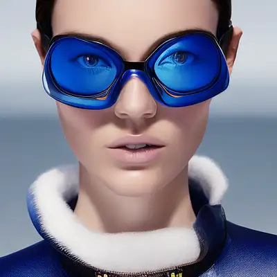 Fashion shoot, Jacquemus and Moncler collaboration: dark blue translucent futuristic sunglasses, hyper-realistic, detailed 8k, realistic --ar 2:3 --s 750