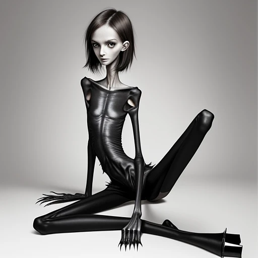 extreme skinny slender anorexic girl very skinny slender girl, with long curved claws, skinny legs in high heels , lying position