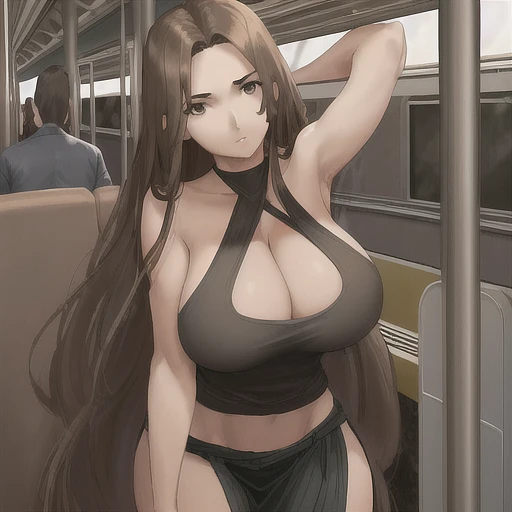 a woman, long brown hair, beautiful face, black tank top, large bust, bending down slightly, super realism, 8k, alot of cleavage, inside of a train