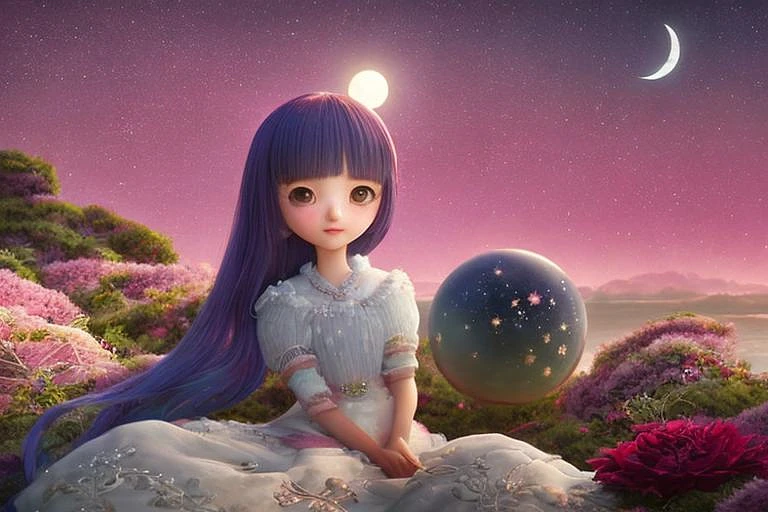 500 mm lens photo, a pink moss rock, uhd, (full light yellow intricate moon) in night sky, cozy indoor lighting, digital painting, cinematic, character design by mark ryden and pixar and hayao miyazaki, girl in a dress covered with pink peonies, (detailed pupils:1. 9) , (highly detailed symmetrical eyes) :1. 9, (highly rendered eyes) :2. 0, close-up, (god rays) , art by studio by Edward Tsang, Andy Chin, cinematic lighting, movie still, deep focus, horror movies style, super resolution, dark moody, realistic shaded lighting by ilya kuvshinov, highest detail quality, long exposure, hyperrealistic, shot on Canon 5D, unreal engine 5, octane render, 8k