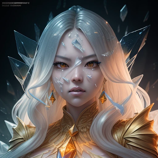impressive ominous fine golden lady shattered crystal shard glitch volumetric dynamic fluid simulation lighting impressive masterpiece hyper ultra detailed intricate sharp focus 8 k realistic illustration canon eos r 3 fujifilm x - t 3 0 sony alpha, by james gurney tooth wu artgerm colorful! ! ! , trending on artstation behance cgsociety --ar 3:2 --c 15 --s 5