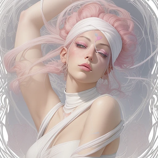 a beautiful woman withepink hair in a white crop top, in the style of light white and dark silver, hannah yata, y2k aesthetic, fine lines, delicate curves, slumped/draped, smooth and shiny, manjit bawa --ar 1:2 --stylize 750 --v 6