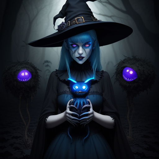 DreamShaper prompt: A cute witch blue glowing eyes holding a monstero...