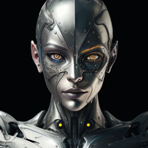 Cyborg, front view, metallic skin, melting into the patinated background, brilliant modern abstract metallic make-up, capturing the intricate details, intricate details, HDR, beautifully shot, hyperrealistic, sharp focus, 64 megapixels, perfect composition, high contrast, cinematic, atmospheric, moody