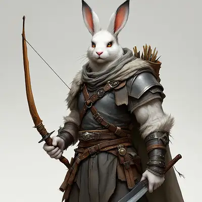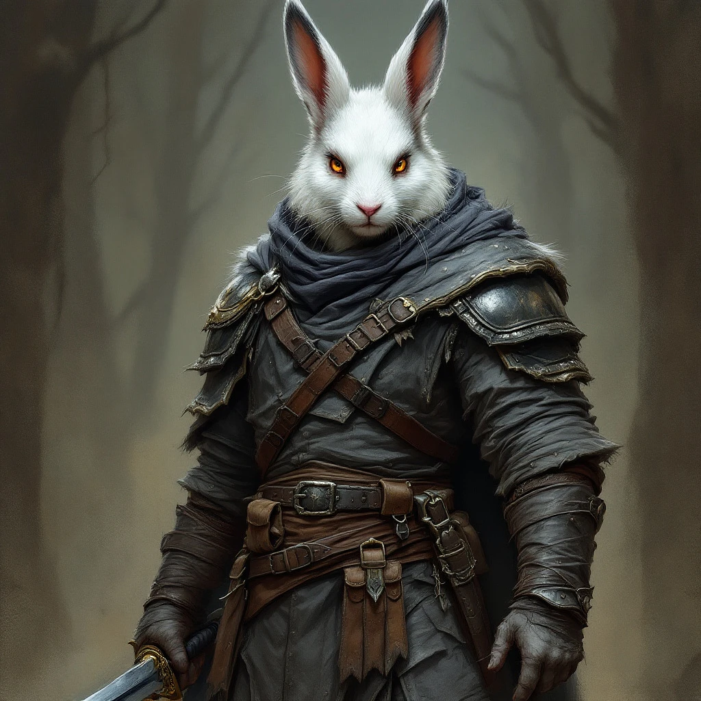 male d&d harengon, male dnd rabbitfolk, :: white fur with grey tipped ears, male rogue wearing grey leather armor, leather belt with lots of black buckles and pouches, dagger sheathed on hip, holding a short sword in one hand , highly detailed, dnd character art, high fantasy, fullbody big brown eyes