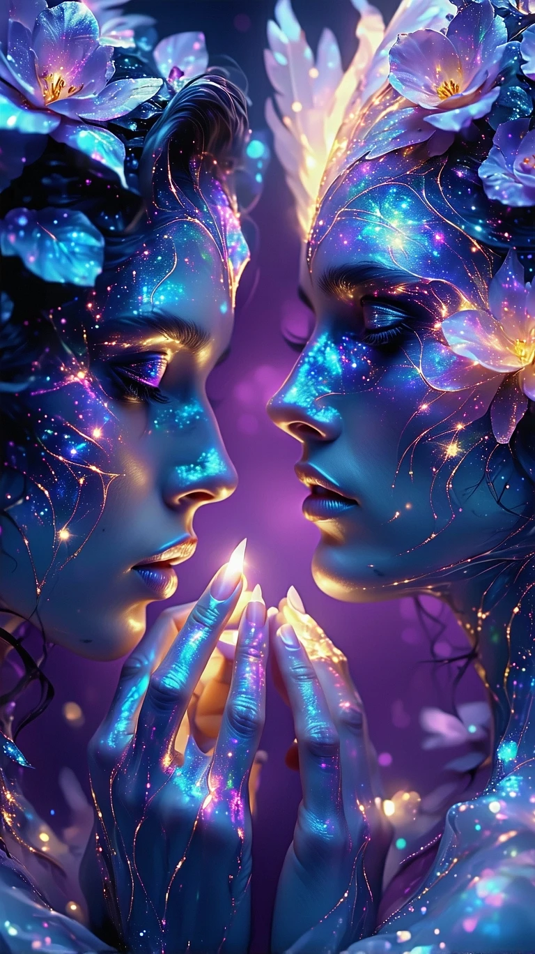 hyper-realistic gold, opal quartz, neon hues, silver holographic reflections, and cosmic textures Two celestial beings with bodies made of swirling galaxies reach for each other, their fingertips melting into golden liquid light. Above them, a divine entity with radiant wings oversees their fate. Floating roses bloom and dissolve in the air, forming patterns of sacred geometry. The sky shimmers in deep violet, electric blue, and glowing opal hues. Salvador Dalí surrealism, highly detailed, ethereal, 4K Salvador Dalí-Inspired Surrealism, optimized for maximum detail and dreamlike quality. Each prompt follows a structured format, ensuring consistent surrealistic themes, psychedelic aesthetics, and celestial mysticism.