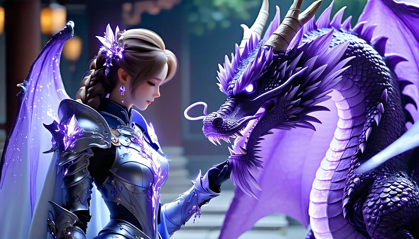 final fantasy, human babe, fantasy big beautifull armor with extrem many details and accesories, glowing, mystic. she stands with a purple dragon. she touched him. dragon is sweet and nice